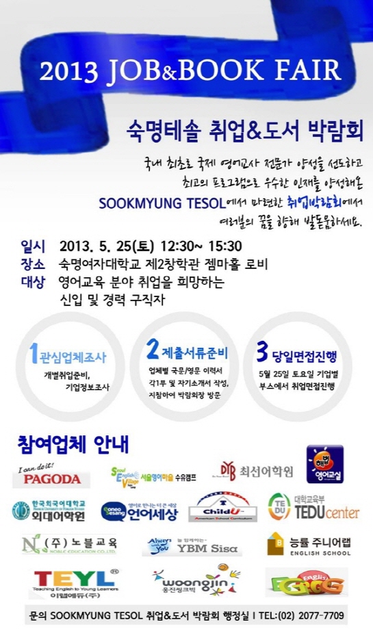 - 2013³âµµ ¼÷¸í¿©ÀÚ´ëÇб³ Å×¼Ö(TESOL)°úÁ¤ Á¹¾÷»ý, ÀçÇлý ´ë»óÇÑ JOB FAIR¿¡ ÀÌ·¦¿¡µàµµ Âü°¡ÇÏ¿´½À´Ï´Ù.